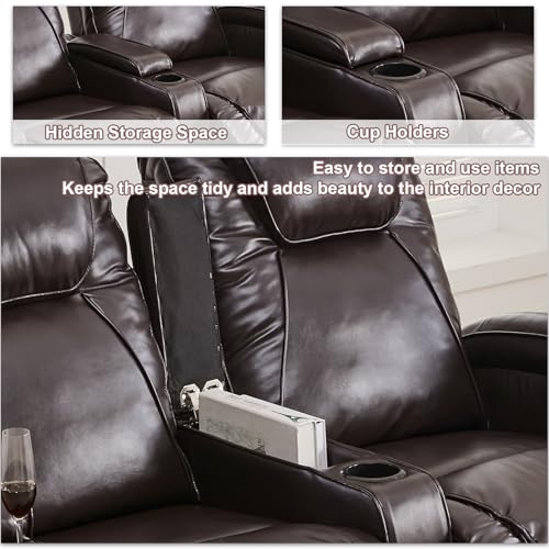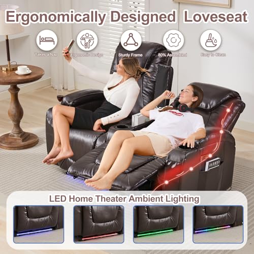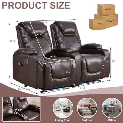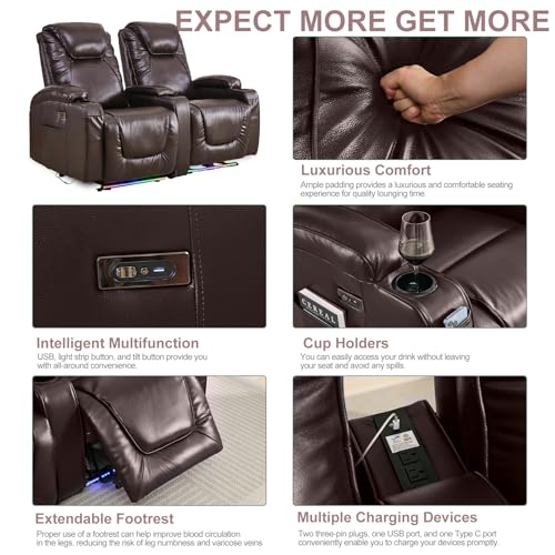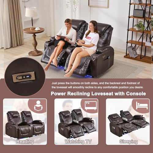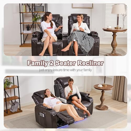 RV Reclining Loveseat Recliner Wall Hugger Recliners,RV Theater Seating Seats Theater Chair Theater Recliner Sofa Love Seat with LED Light/USB/Type C/Cup Holders,Power Recliner Chair (Brown, 62)